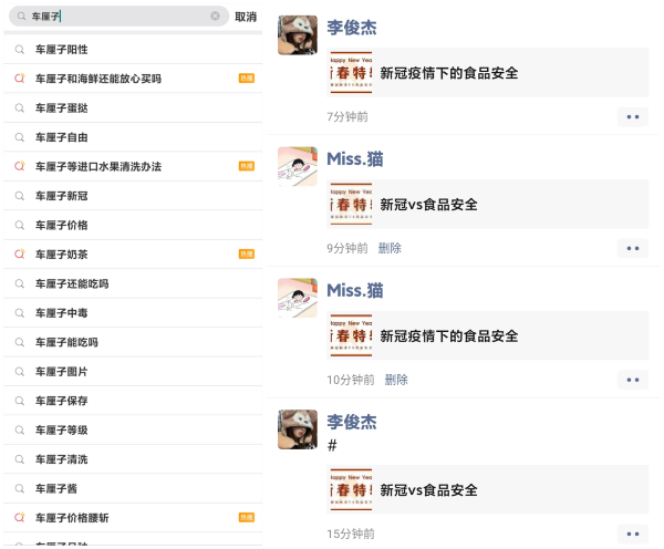 新冠疫情再次爆发过程中,众多食品被检测出新冠阳性,志愿小队“动物园rapstar”为响应防疫管控要求,进行了线上防疫宣传活动,以引起身边人对疫情间食品安全的重视并科普正确购买、处理食品的方法。 (图为线上宣传)动物园rapstar队的成员们通过问卷了解身边亲友对于疫情间食品安全的态度,并进行数据分析、原因究寻,根据分析结果,积极搜寻相关科学知识、专家详谈,确定准确性后通过发送微信公众号推送的形式传达给身边亲友...