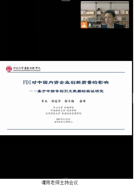 师生带来了“FDI对中国内资企业创新质量的影响—基于专利引用数据的经验证据”的讲座。李兵教授首先讲述他们利用1985-2017年的专利引用数据,从专利被引数量、专利基础性、专利原创性、专利知识宽度和专利续费五个方面测量了专利质量。并结合中国工业企业数据库系统性探究了FDI对中国内资企业创新质量的影响。接着通过实证分析表明,FDI对同行业内资企业的创新质量没有显著影响,FDI对其上游的内资企业创新质量有促进作用,但是对其下游的内资企业的创新质量有抑制作用。FDI对不同类型的内资企业创新质量的影响存在差异,FDI对国有企业、出口导向型企业、技术密集型企业和中型企业的创新溢出效应更明显。最后,李兵教授及其合作者还验证了吸收能力和人力资本两个可能的机制,经验证据表明,吸收能力更大的内资企业受到的溢出效应更大,企业坐落在拥有大专及以上学历的人才比例较高的地区有助于扩大外国直接投资的知识溢出效应。