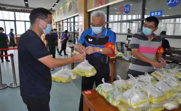 疫情防控一线,为驻校人员送去关怀和慰问。为保证每位同学都能吃上热乎饭,张为付副校长带头加入食堂服务志愿者的行列。他早早地做好防护工作,比食堂其他志愿者更早一步进入食堂,在午饭打包处“时刻待命”,熟练地传递饭菜、清理台面,张为付副校长此刻已经完全融入食堂的工作中,成为了抗疫志愿者中的一颗“螺丝钉”。在参与食堂志愿服务的过程中,张为付副校长与驻校人员进行热情交谈,详细了解大家的工作困难及身心情况等,重点了解学生在校生活情况。张为付副校长叮嘱大家,当前疫情防控形势依然严峻复杂,在做好疫情防控工作的同时也要注意自我防护,希望驻校人员在后续的疫情防控工作中继续发扬团结一致的良好作风,鼓足干劲,共同筑牢校园安全防线,全力守护学生生命安全和身体健康。