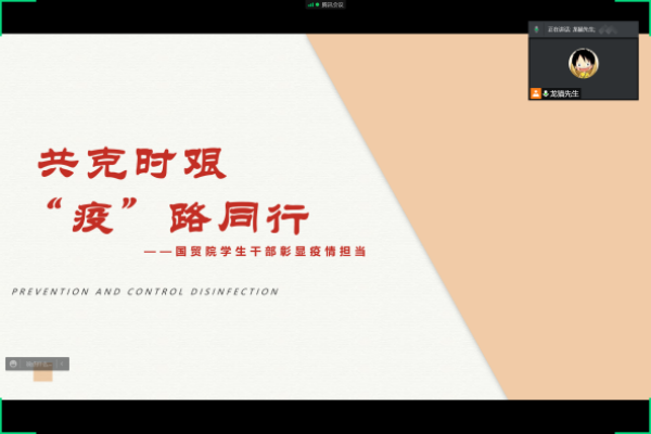 疫情防控状况做了简要说明,随后重点讲述了作为学生干部,应该率先发挥作用,为广大同学做出表率。在日常工作和活动中不聚集,鼓励以线上形式开展丰富多彩的校园环境,同时要更加注意网络发言,做到不信谣、不传谣、不造谣。鼓励大家争做疫情防控的“先锋员”,做疫情防控工作的重要力量和得力助手,继续做好带头防控的表率、履职尽责的表率、服务同学的表率,