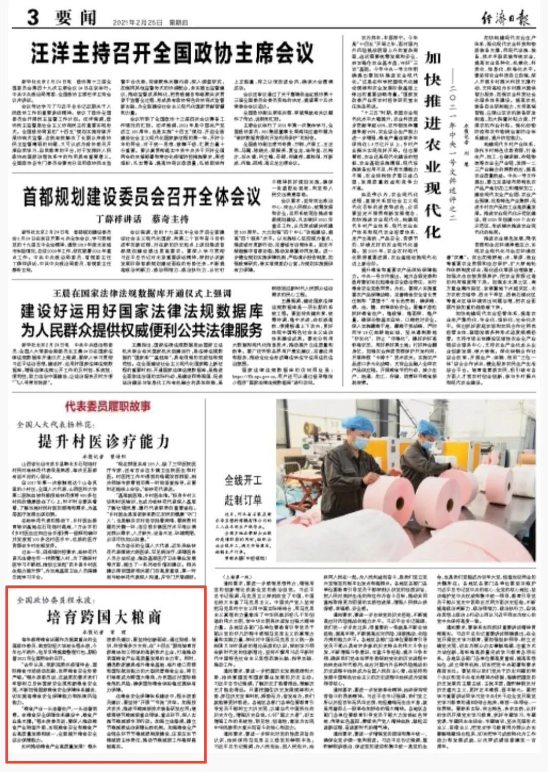 2月25日《经济日报》:全国政协委员程永波:培育跨国大粮商