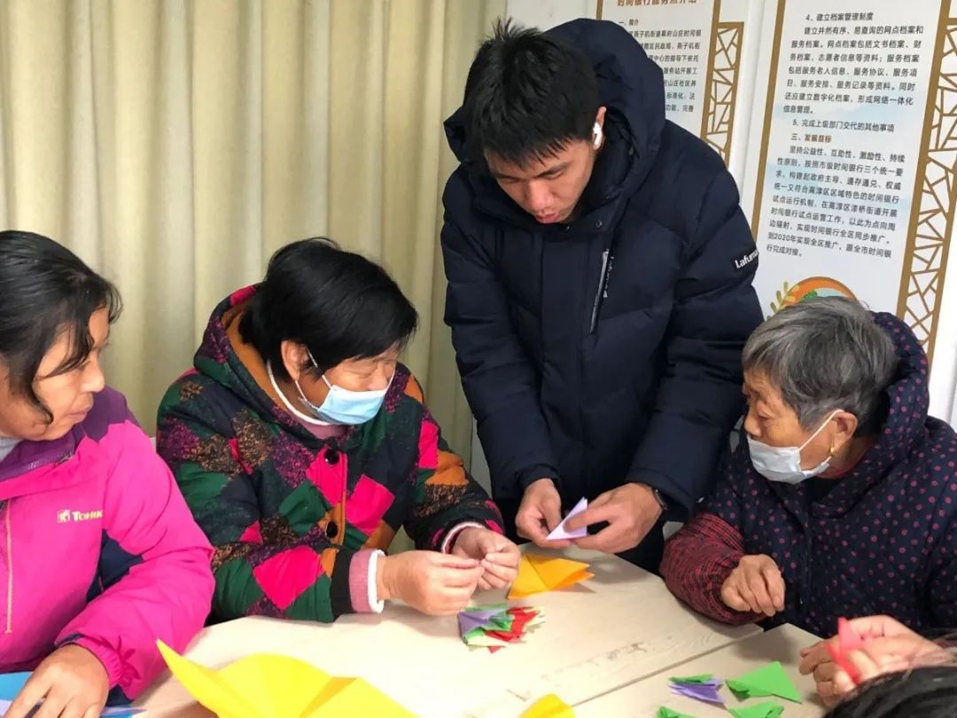 当志愿者们带着五颜六色的卡纸走进幕府山庄的养老活动中心时,吸引了很多爷爷奶奶的目光,志愿者施蕾热情地朝爷爷奶奶解释道:“今天啊,我们就是来陪您的,您可别嫌我烦啊!”一位奶奶打趣道:“你们不嫌弃我们还差不多呢!”大家听了忍不住哈哈大家,气氛顿时活跃了起来。随后志愿者们分批行动,部分志愿者与养老院负责人沟通好后,帮助养老院打扫卫生与整理物资;另一部分志愿者则陪老人聊天、读报。为了放松老人心态,让话匣子打开,志愿者们准备了一个较为简单的手工,一边制作一边谈心。