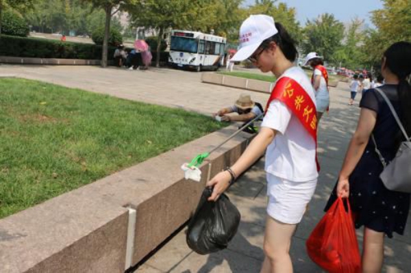 2017级党支部党员志愿者张安慧同学在7月26日响应了她家乡那里社区的号召,参与在重要路口检查卫生环境,随手捡拾路旁的白色垃圾。