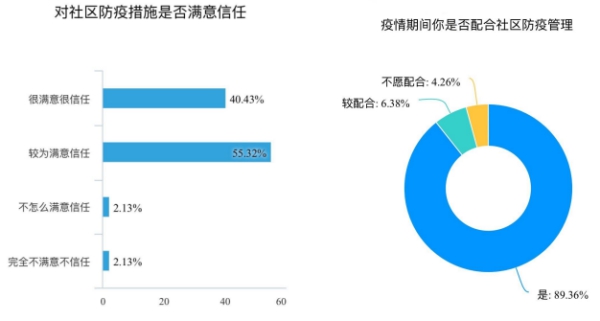 为了增加调查的普遍性、真实性与客观性,除去实地调查外,小队成员还通过网络渠道发布调查问卷,充分了解全国各地基层防控组织工作的开展、实施及成效。在了解群众对基层(尤其是社区)防疫措施的情况时,小队成员发现40.43%的群众对社区措施及工作十分满意且信任,55.32%的群众较为满意与信任,但仍有4%左右的群众对社区的防疫工作不是特别满意,也不信任。这样的数据结果表明,基层防疫在一定程度上已经取得了群众的信任与支持,但依旧不能获得完全的认可,还需要做出一定的改进。对于疫情期间群众是否积极配合社区防疫管理的问题,经调查后发现,89.36%的群众对社区的防疫工作都十分配合,但仍有6.38%和4.26%的而人们比较配合甚至不愿意配合。对此,小队成员一致认为,团结才是战胜疫情的关键。基层防疫人员需要多考虑群众的不便之处,执行任务时不要过于刻板,同时,群众也要多多理解工作人员的辛苦,认识到疫情的严重性,主动配合基层防疫人员的工作。唯有团结一心,才能成功抗疫。