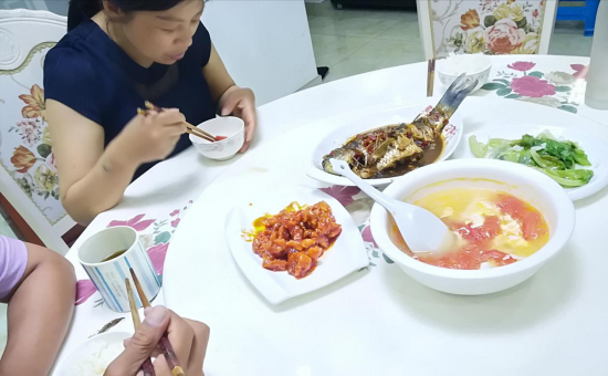 活动中,电子商务1902王顺磊同学晒出的一张照片让人感动,那是一家人围着圆桌吃饭的温馨场面。王顺磊同学十分贴心地在家帮着父母做晚饭,一道咕咾肉让他在自家的厨房里崭露了头角,出骨的精肉在各种调味料和淀粉的拌和中制成大肉圆,滚入油锅里一番“沐浴”至酥脆,盛盘中后淋上糖醋卤汁,便可大快朵颐。让疫情期间的紧张焦虑情绪烟消云散吧,好好享受珍惜一家人温馨用餐的幸福甜蜜。