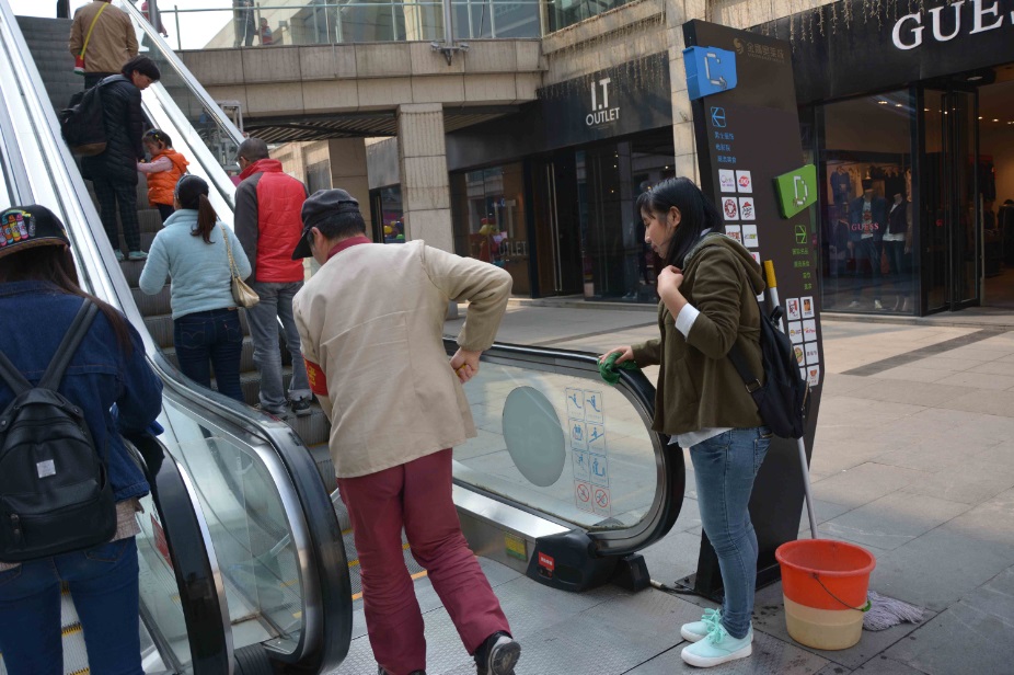 (帮助商场清洁工人打扫扶梯)
