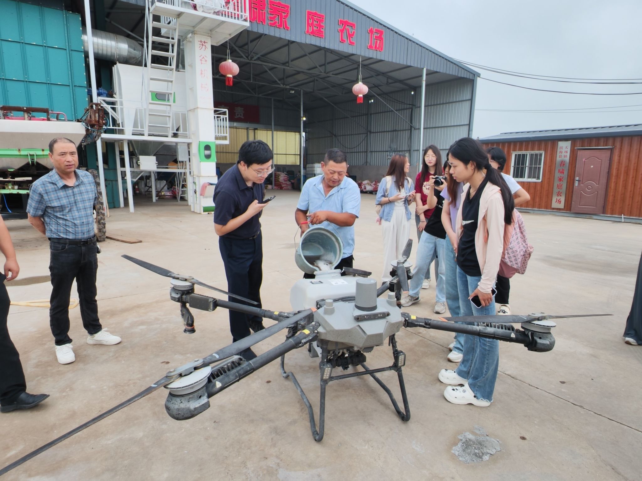 调研团队前往盐城市滨海县天场村种粮大户“春晓家庭农场”进行实地调研,负责人现场介绍并演示农业无人机操作流程,并表示政府持续为农户补贴植保无人飞机,农户能以较低成本使用无人机播种、撒药,为当地种植户带来了产量和经济收入的提升。在本次参观中,团队成员切实体会到了现代农业对水稻、小麦等粮食作物种植进行数字化、精准化、智能化管理在降低运营维护成本,提产提质增收等方面带来的真实效益,为“数商兴农”指明了方向。