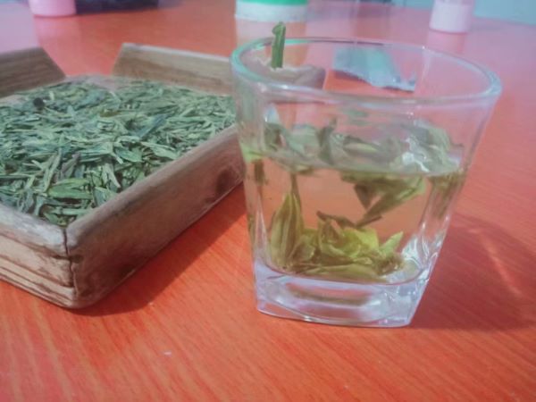 介绍之后奶奶又邀请队员们品尝一下狮峰龙井,并介绍说这边人边喝龙井茶大多用玻璃杯,水温一般控制在85摄氏度左右,这样泡出来的茶叶汤色碧绿明亮,口感极佳。队员周盼表示:“品尝过后有一股淡淡的清香、然后慢慢变得甘甜、并没有预想的苦涩”。之后小队成员了解到现在喝的是夏茶所以叶子宽宽的、颜色油油的、泡起来是很大的叶子,而春茶的叶子就比较小了。奶奶也提到这种夏茶的销量也不错,价格实惠所以有很多人前来购买,而奶奶也透露自己家做茶叶已经上百年了,茶对她来讲更是一种传承。