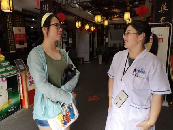 (图为团队成员对震元堂主任医师胡洁进行采访 燕芙蓉 摄)
