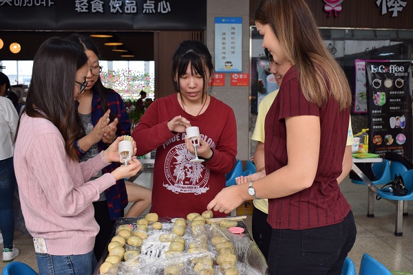 ”和少数民族"福"字样的月饼送给了留校同学、少数民族同学和留学生同学。彝族同学周学艳表示:“自己家里没有中秋节吃月饼的风俗,我要把亲手做的月饼寄回给自己的爸妈尝一尝,让家里人一起感受一下中秋节的氛围。”