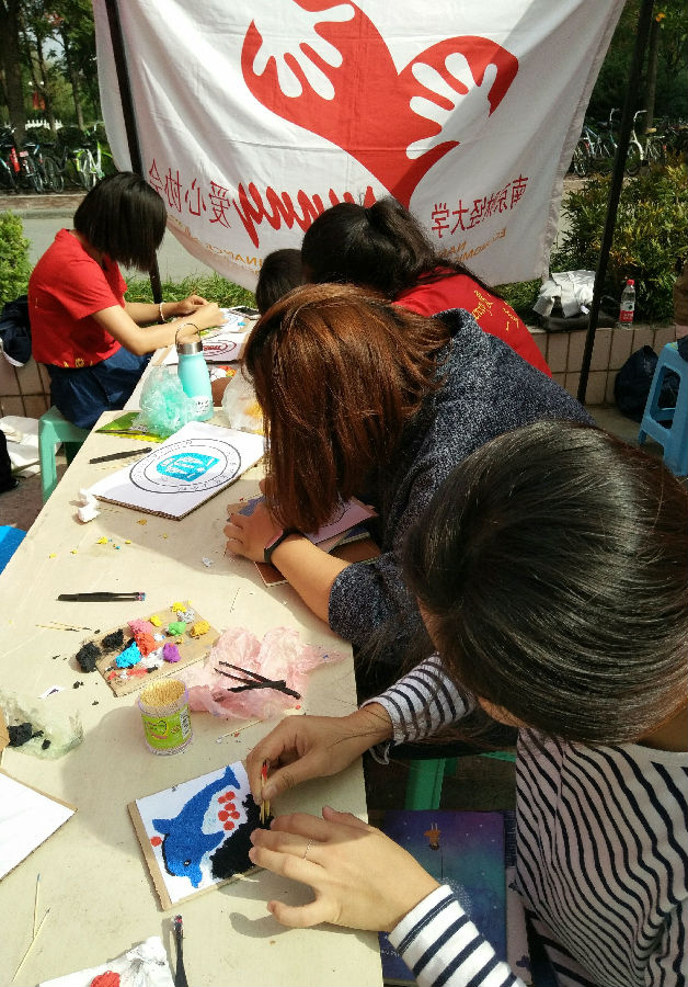 参与活动的同学挑选一个自己喜欢的图案,用镊子将已染色的纸浆夹出,并填充在图案内。同学们小心翼翼地制作,在现场负责人员的指导与帮助下收获了一个个小小的成果。不一会儿,天真烂漫的阿狸、乐于助人的哆啦A梦、独特新颖的“表情包”等风格迥异的成品跃然纸上。活动负责人向大家介绍说,纸浆画的材料都是常见的废纸、旧报纸、传单等,将废旧纸张剪碎,装在饮料瓶中,加入水泡烂,除去多余水分后加乳胶和颜料,搅拌成染色均匀的橡皮泥状。活动现场还展示了精心制作的各个星际娱乐场
