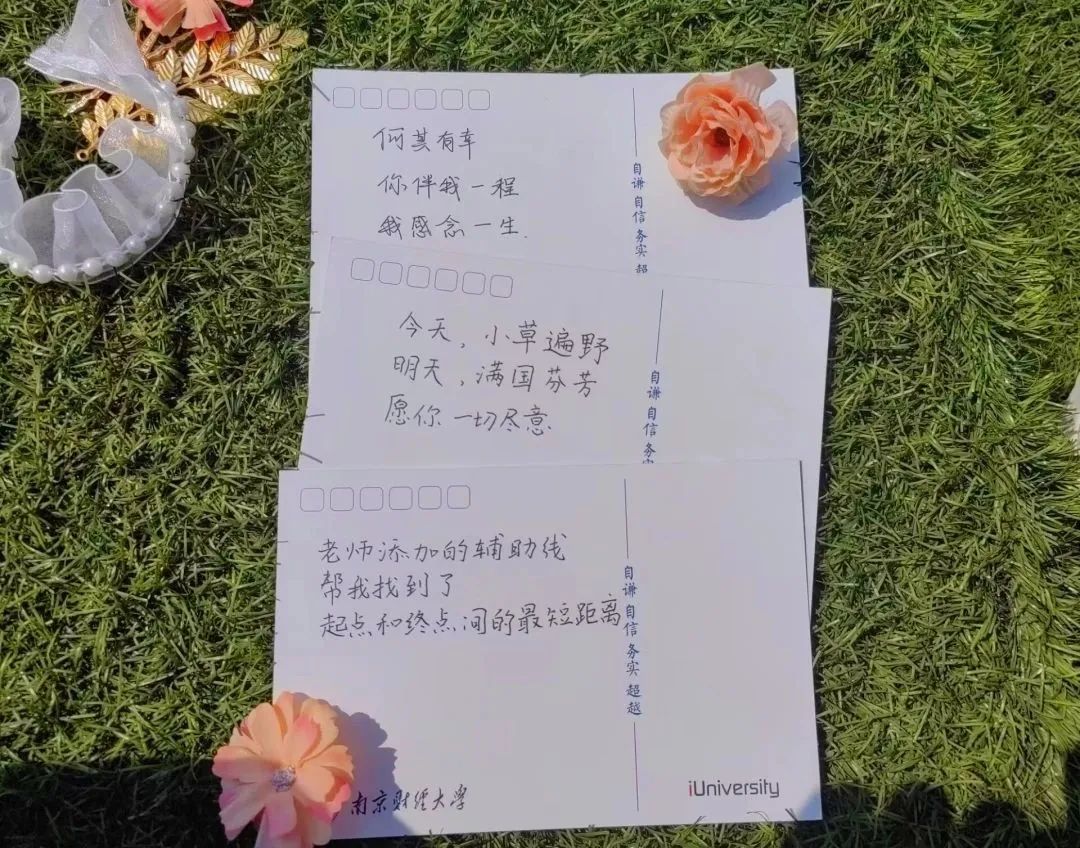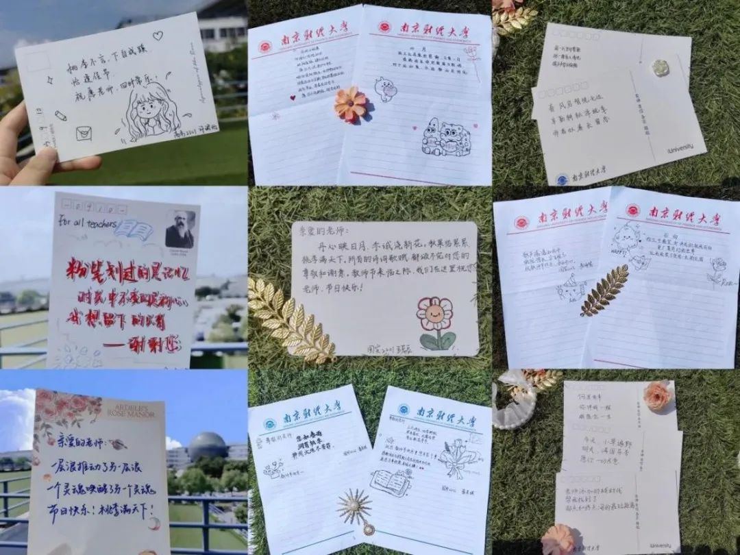 “三尺讲台,四季耕耘,寒来暑往,风霜雨雪,育出新蕊亭亭”,在国贸2202班的盛美琪同学的心中老师扮演的既是引路人,更是播种者。信纸上不仅有饱含深情的文字,还有手绘的书本与花束,以此来表达对教师们传道授业的感谢和对辅导员们关心陪伴的感激。国贸2203班的庄晓玲说到“桃李明白,春风所做的每一件事”,落笔之时,脑海里浮现的一幕又一幕都是老师们辛勤的身影:课堂上的循循教诲,办公桌旁的耳提面命,露台边的促膝长谈……伴随着这些画面一起涌出的,还有她对老师们真挚的感激之情。
