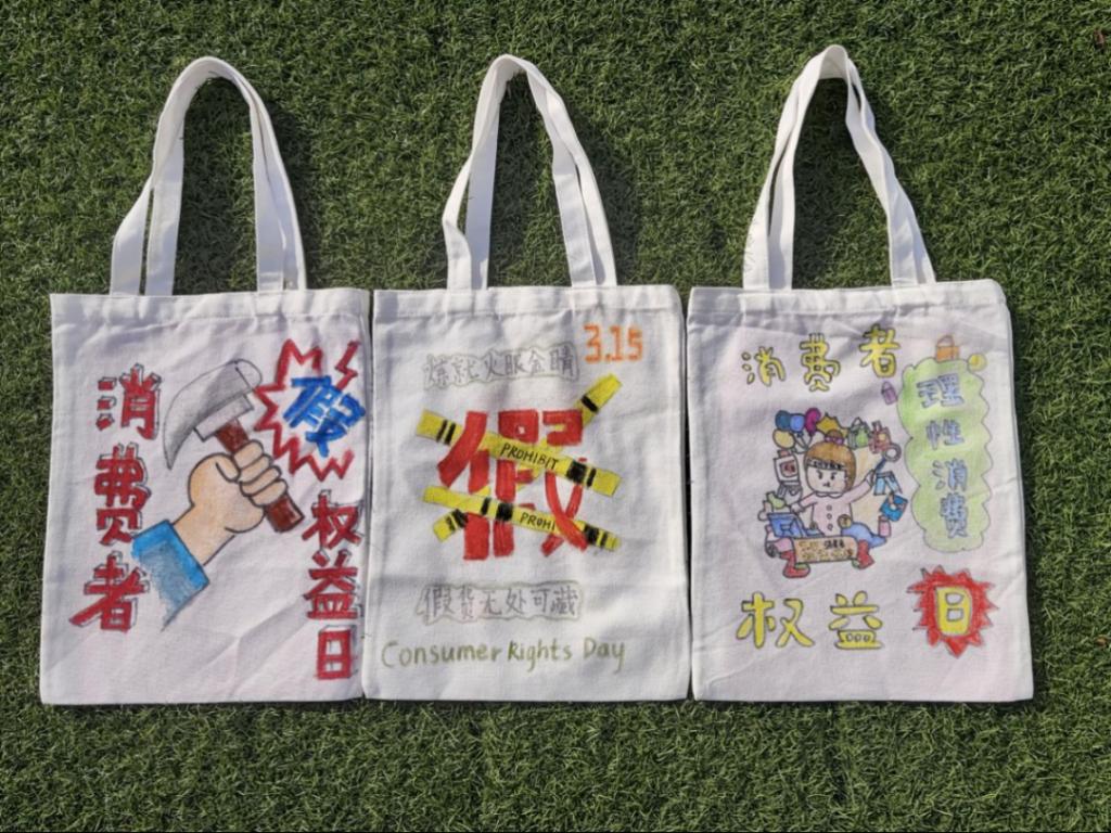 同学们选择了手绘帆布包的方式来宣传消费维权知识、倡导大家合理消费维权。一个个帆布包上承载着同学们对美好消费未来的期待。铅笔笔尖在帆布包上来回摩擦着,时而细致,时而粗略,“沙沙”的声音回响在教室里,片刻功夫,包上就出现了大体轮廓。接着是上色,一支支彩笔在同学们的手中翩翩飞舞着,犹如春风,带来了五彩缤纷,原本单调的图案顿时生动形象了起来。“半开的礼物盒里藏着一颗心,一旁的小旗帜上印着‘315’,寓意着‘权心权意只为你’,通过这幅画我们希望消费者权益能被大家重视。”贸经2201班的陈晨这样介绍她的画。