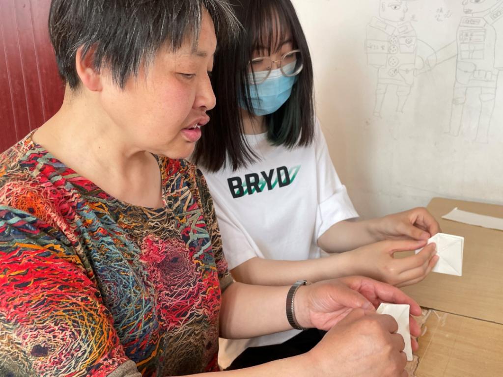 稍晚时分,到了唱歌的环节,志愿者和学员们都分享了自己喜欢的音乐。动听的歌声在小小的屋子里唱响,大家跟着音乐的节奏微微摇摆,时不时吟唱着共同喜欢的歌曲,歌声也许没有那么动听,唱歌的人们却是发自内心的快乐。音乐时光很快就结束了,志愿者们带领博爱之家的学员们开始一起制作小手工。学员们摆弄着手中的卡纸,跟着志愿者们的讲解,开始制作纸飞机。志愿者们耐心地为学员们指导,学员们认真地跟着志愿者一步一步进行。终于,一个个纸飞机诞生了。志愿者为学员们做示范,口中哈一口气,捏紧机身,用力向前方一掷,小飞机便悠悠飞上了天空。学员们争先恐后地掷着纸飞机,脸上露出了孩子般稚气的笑容。志愿者们为学员们拾起纸飞机,轻轻挽着他们的手臂,一行人在博爱之家的小院里谈笑风生,一派其乐融融的景象。不知不觉间,活动已进入了尾声,收拾好桌椅后,志愿者们向学员们挥手告别,依依不舍地离开了。