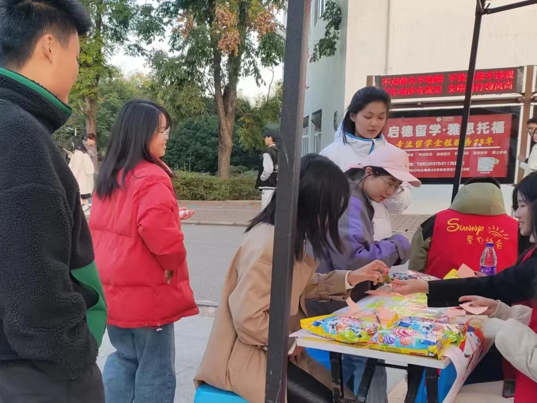 第二声问候,给食堂阿姨早起备菜的阿姨们,交流间,阿姨嘱咐同学们吃饱穿暖,注意防寒,这是关心与关爱的传递。食堂门口,志愿者们正在为考研学子征集祝福语,愿他们金榜题名,学有所获
