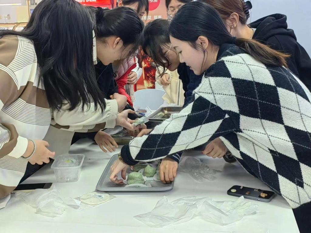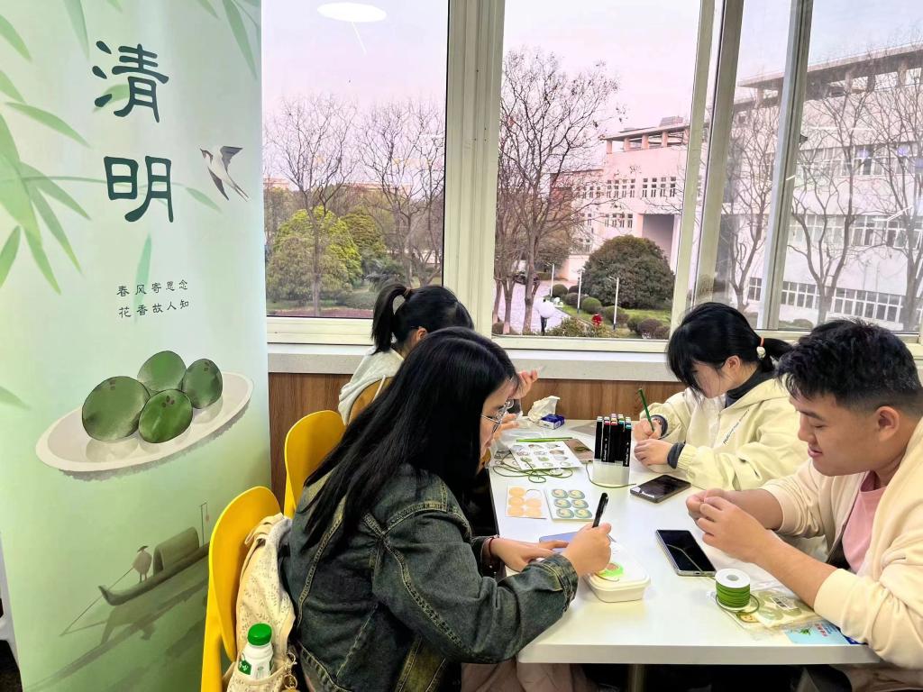 在中苑食堂二楼举行“风气清明,青团飘香”主题活动。“古时有寒食禁火祭墓,清明新火踏青的习俗,前者怀旧悼亡,后者求新护生,两者在文化内涵上密切相连,在时间上也紧密相连,寒食第三日即清明...”活动主持人娓娓道来寒食节的来由,一则则生动有趣的典故引人入胜。伴随着主持人的讲解,同学们开始学习青团的制作过程。有的负责和面,有的负责调馅,有的负责包制,食堂里草头汁水清香四溢,蒸好的青团清甜甘香,软糯可口。翟羽佳同学感叹到“介子推忠义廉洁的气节仿佛伴随着艾叶香气浸润在春日的校园中。“此外同学们还用画笔与颜料手绘了青团小盒,将春日烂漫与清明雨雾相结合,呈现出别样的烟雨江南意境。独享不如共享,同学们纷纷将做好的青团包上精美的包装,送到食堂阿姨、宿管阿姨们的手中,共同品尝这一美味。