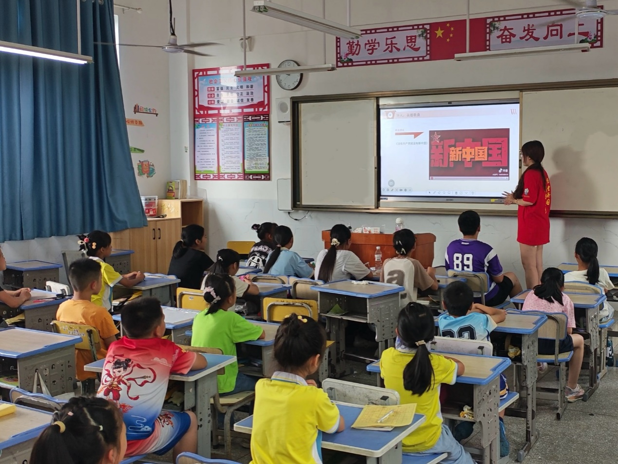 “我们是共产主义接班人,继承革命先辈的光荣传统……”在党史学习教育课上,稚嫩的童声与播放的原版歌曲形成奇妙和声。支教团队特别设计的红色歌曲环节,让孩子们在学唱经典歌曲中感悟信仰力量。当唱到“没有共产党就没有新中国”时,许多孩子自发加入手势,教室里挥舞的小手与教室外的国旗交相辉映。