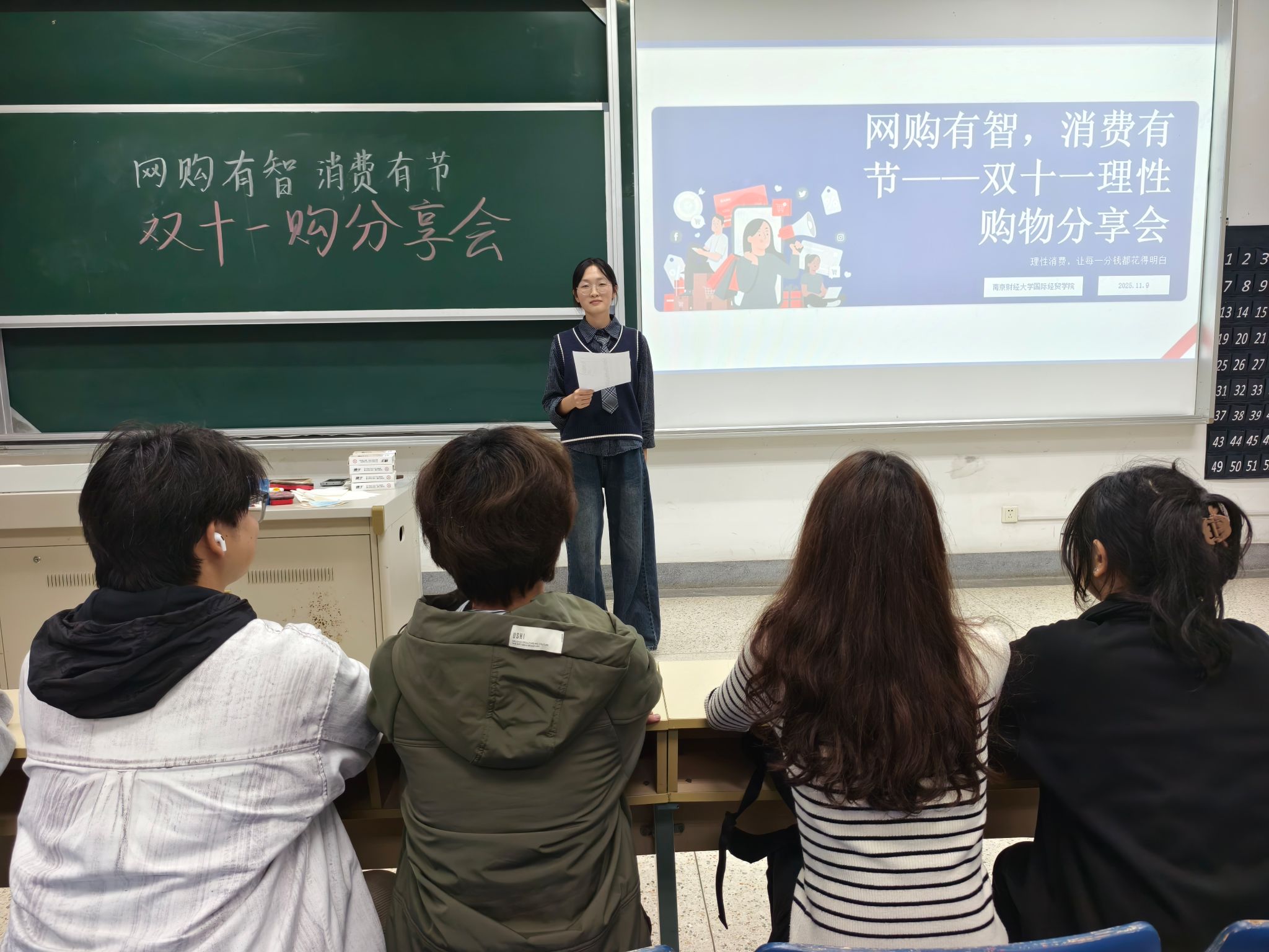 分享会由主持人邹可颖拉开序幕。她以幻灯片形式,结合自身观察,分享了关于理性消费的见解。她提到,随着数字经济的快速发展,“双十一”已不仅是一个促销节点,更成为观察当代年轻人消费理念与行为的重要窗口。面对铺天盖地的营销信息,如何保持清醒、做出理智的消费决策,是值得每一位同学思考的问题。