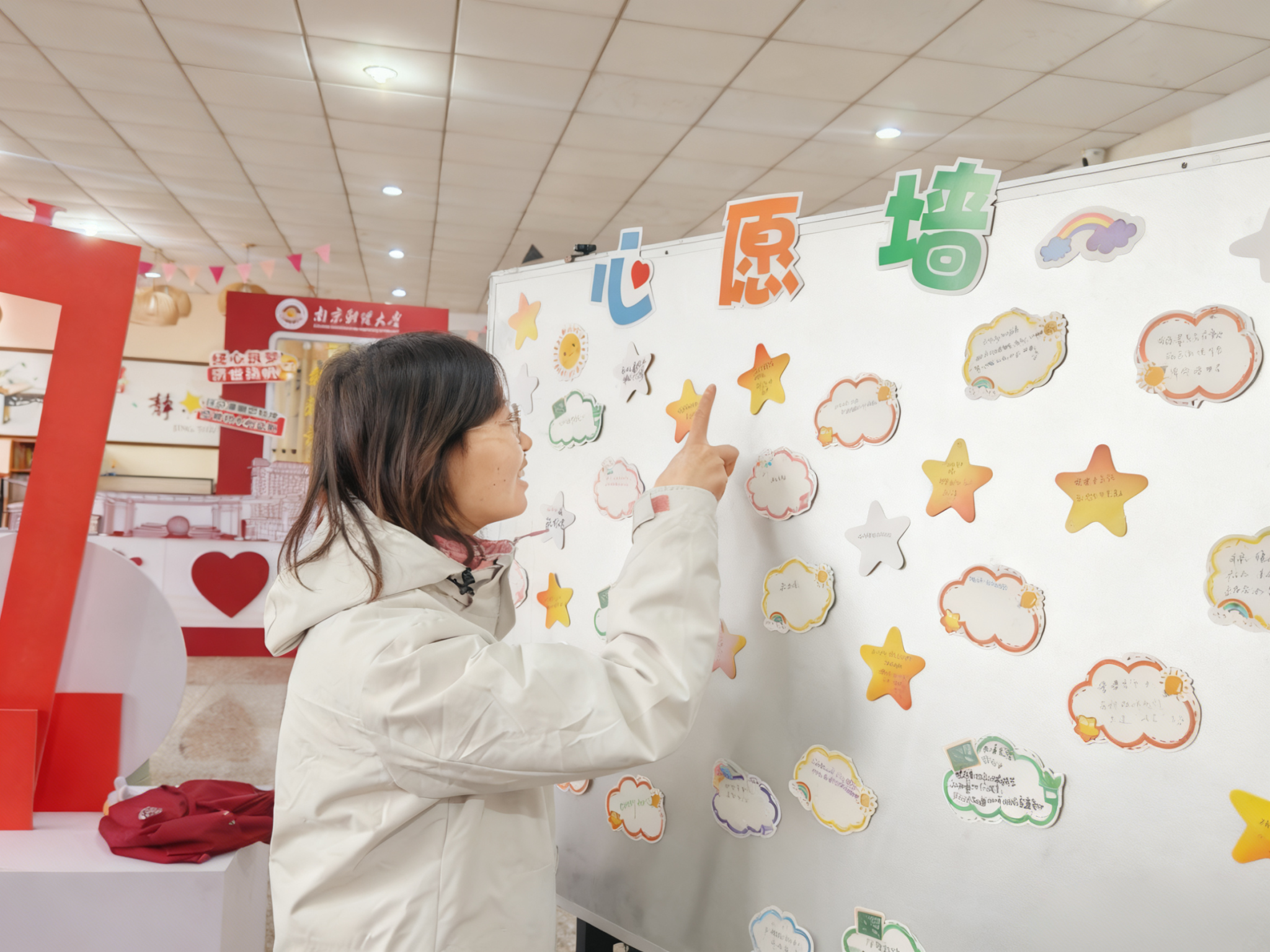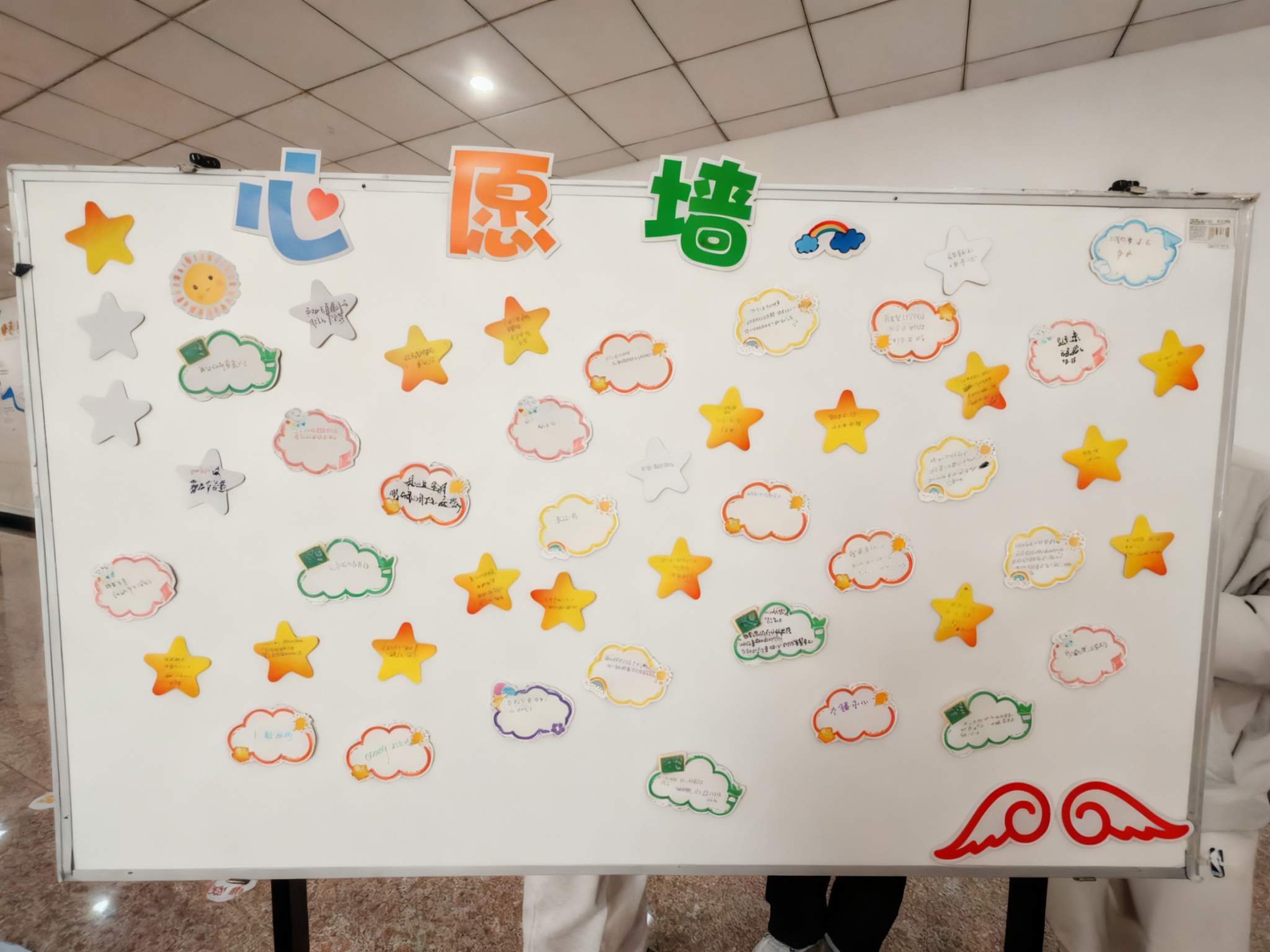 在节日精神的共鸣中,活动转入“星光与乌云”互动环节。志愿者向每位成员分发星星、乌云两张便签纸,分别象征“成长高光时刻”与“生活小小烦恼”。成员们将近期的“竞赛获奖喜悦”“好友互助温暖”写在星星便签上,把“学业进度焦虑”“时间管理困惑”写在乌云便签上。一张张便签陆续贴满展板,化作一面交织欢笑与思绪的“故事墙”。