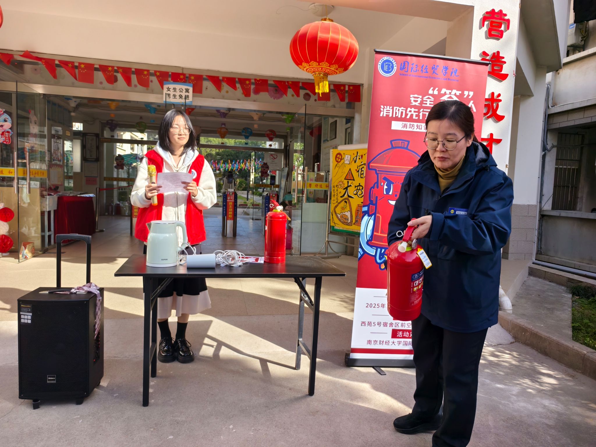 在西苑5号站前开展“安全‘答’人 消防先行”消防知识分享会。活动聚焦学生宿舍消防安全,通过真实案例警示、互动问答及灭火器实操演练,让学生在“学、问、练”中掌握消防技能。