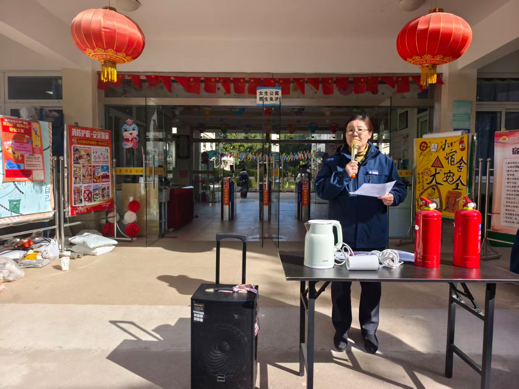 “这些隐患就藏在我们身边,一个插线板、一根充电线,都可能成为火源。”活动伊始,宿管周阿姨分享了南京某高校男生宿舍因插线板长期超负荷使用引发火灾的真实案例。床单被未拔的充电器引燃,整间宿舍物品尽毁,所幸无人伤亡。“宿舍抽烟,使用大功率电器更是绝对不允许的,一经发现必定严肃处理。”这个发生在同学身边的真实事件立即引起现场共鸣,同学们神情严肃。