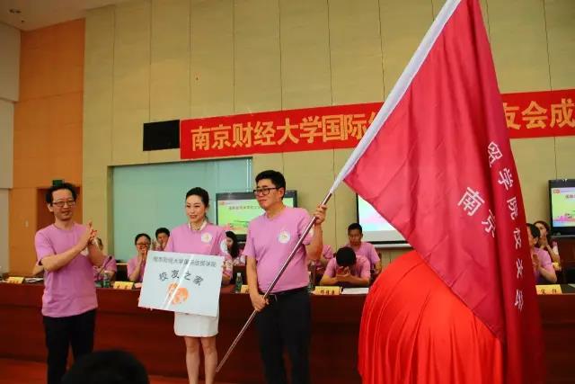 校友会副会长、粮经87级校友陈晓明(右)、国贸03级校友姚艳(中)授旗、授牌