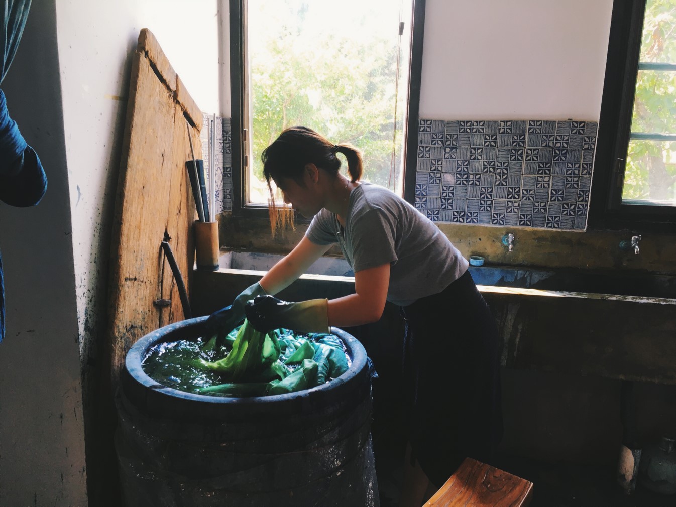 染坊坊主谢军师傅竟来自东北这一事实令团队成员们惊讶,带着粗犷的色彩的北方与蓝印花布这样细腻的工艺之间似乎没有瓜葛,却在谢军师傅身上完美地融合,包含了一种独特的和谐感。