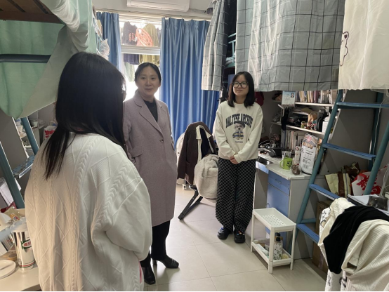 本科生第四党支部政治辅导员徐圆副院长走进12号宿管站3栋504室,与同学们进行亲切的交谈。