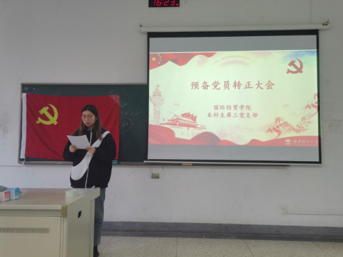 本科生第三党支部在德经楼Z1-110教室召开了预备党员转正大会,讨论预备党员俞天悦转为中共正式党员的事宜。出席此次会议的有本支部全体党员,政治辅导员季霞老师出席并指导工作。