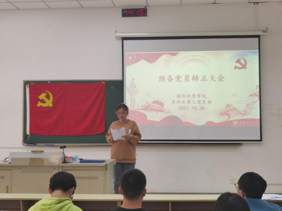 本科生第三党支部在德经楼Z1-106教室召开了预备党员转正大会,讨论预备党员袁萌转为中共正式党员的事宜。出席此次会议的有本支部全体正式党员、预备党员以及发展对象和部分入党积极分子。本次大会由支部书记张朋朋主持。
