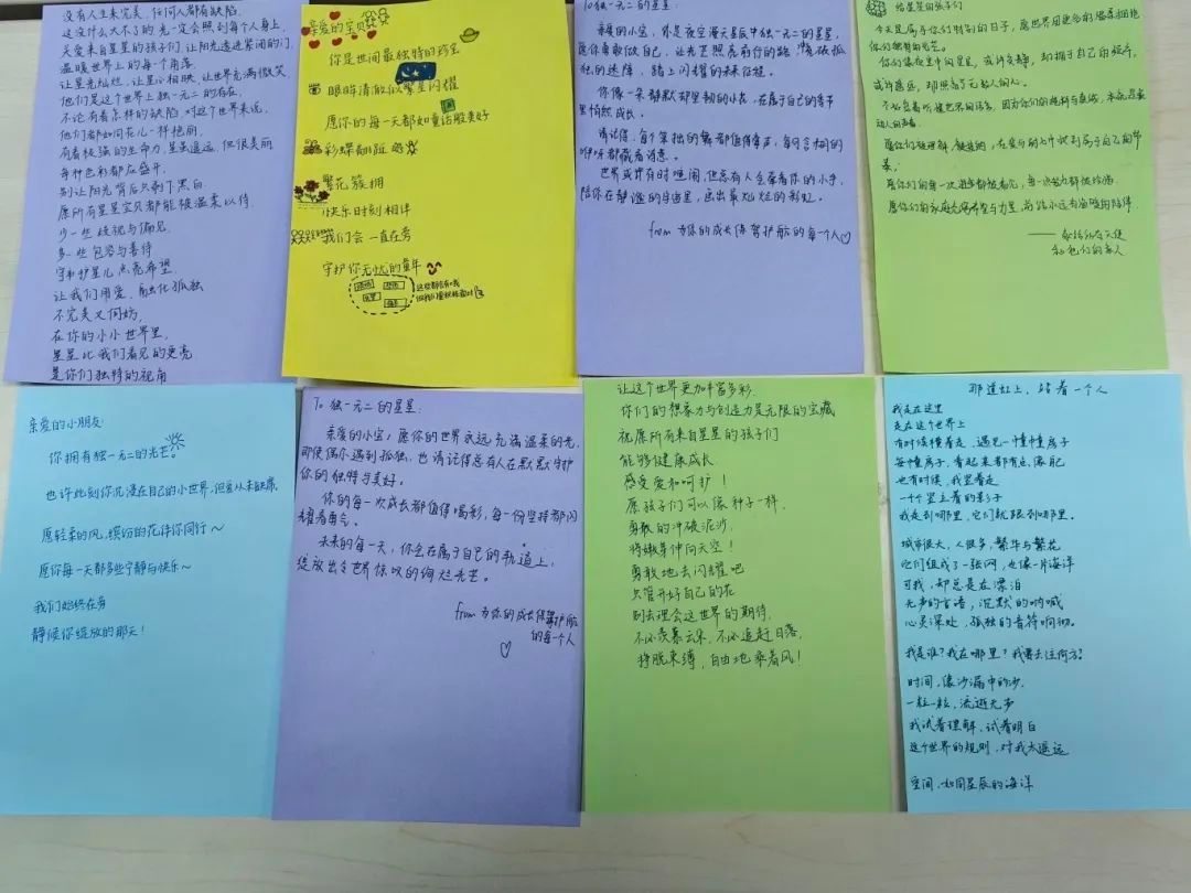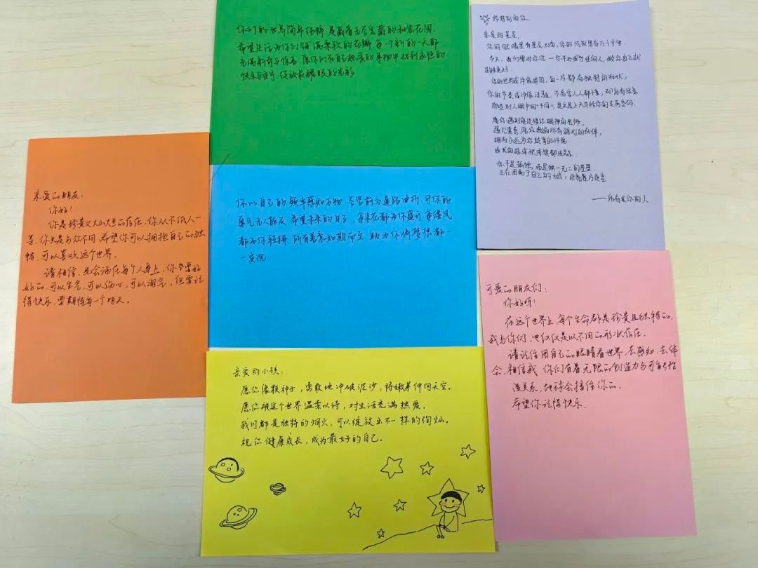 “星星的孩子”他们没有与生俱来的社交能力,不会用表情或肢体语言来表达自己的情绪或感受。尽管不能与自闭症儿童面对面交流沟通,但是很多同学通过网络了解到自闭症儿童,并写下对自闭症儿童真诚的寄语。"你的眼睛里有最亮的星星""我们都在宇宙中守护你"等温暖字句跃然纸上,部分学生更精心绘制了星空主题插画。愿这些承载祝福的寄语,如同和煦的阳光,借助活动的桥梁,温暖他们的心田,驱散阴霾,照亮前行的道路。