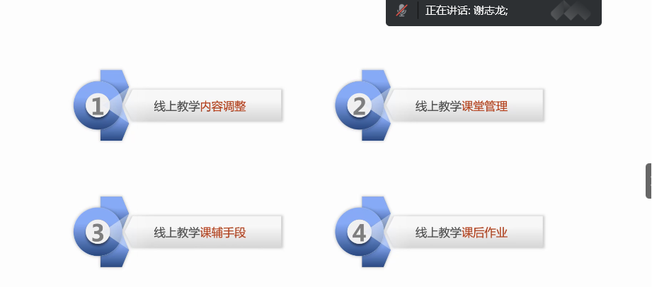 苏应生和谢志龙两位教师分享线上教学经验。苏应生老师立足宏观,从教学督导角度分析如何开展线上教学设计。他以督导老师对线上教学的相关看法、关注点、注意事项三点展开,展示了督导工作中对教师教学形式、内容、效果、质量等多方面的要求,分享了线上教学形式的特点、关注点、注意事项,并对教师应如何开展线上教学工作提了建议,例如教师应重视线上教学工作,及时转变思想,用直播增加互动感,用有效的工具监测学习效果,注重信息安全等。