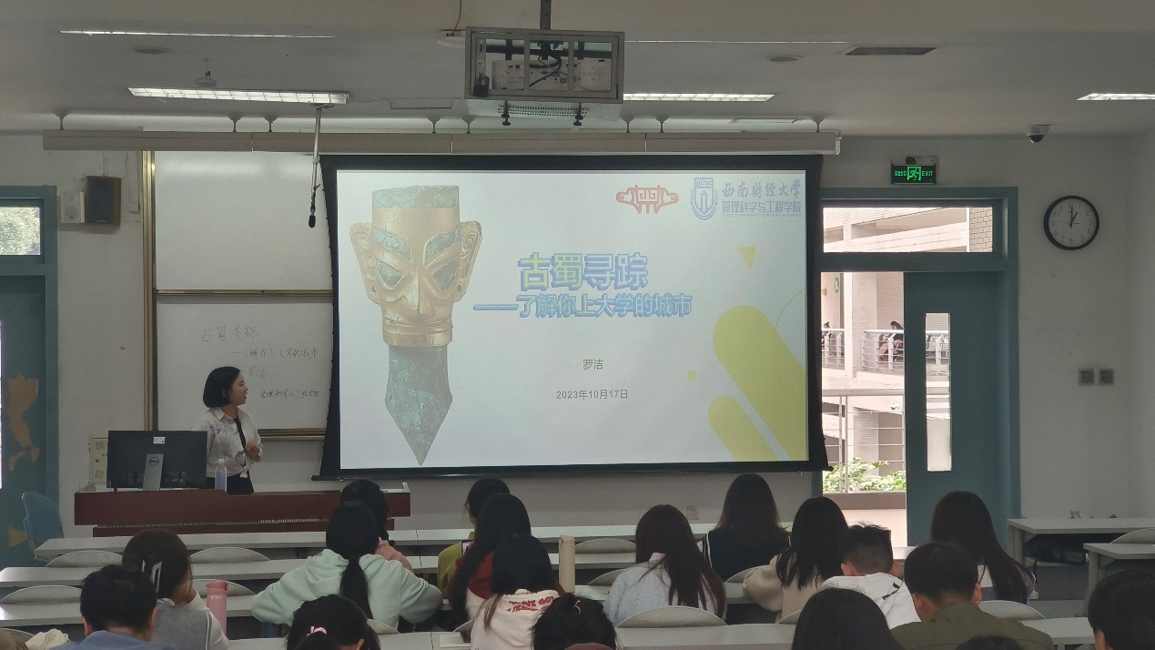 在经世楼F201举办“古蜀寻踪——了解你上大学的城市”文化素质讲座,主讲人为中国博物馆协会会员、四川博物院志愿者委员会委员罗洁,辅导员徐淼主持讲座,来自管理科学与工程星际娱乐场