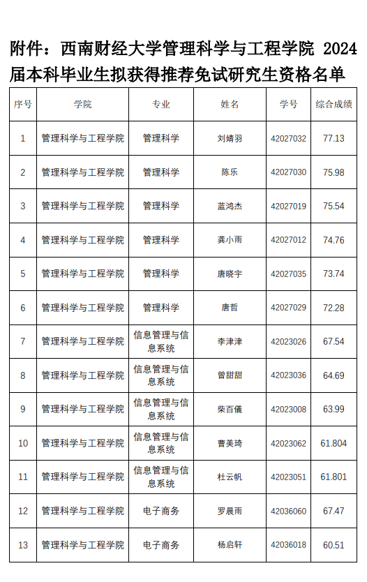 复核,现将2024届本科毕业生拟获得推荐免试攻读研究生资格的同学名单公示于后(见附件)。