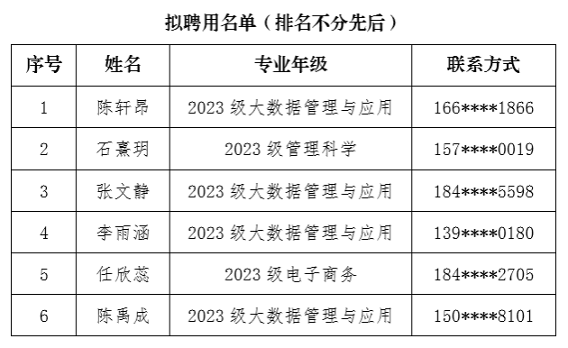 经自主报名、资格初审、面试选拔,星际娱乐场 研究决定以下6名同学为星际娱乐场 2024级本科新生助理辅导员拟聘用人选,现予以公示,公示期为3个工作日。