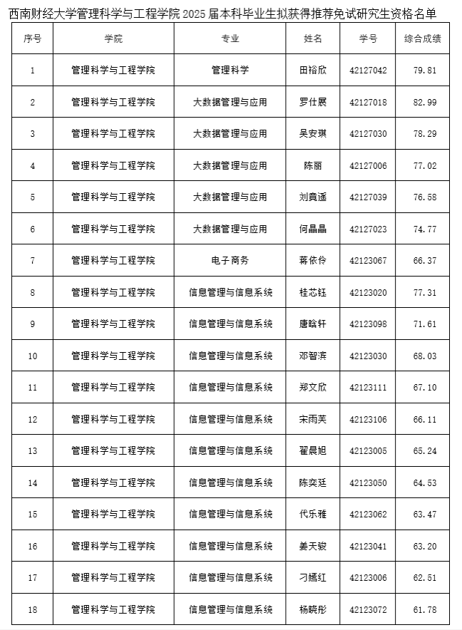 2025届本科毕业生拟获得推荐免试研究生资格名单