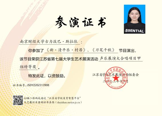 2024年十月,古力孜巴·斯拉依参加第三届“外教杯”江苏省大学生“用外语讲好家乡故事,用中文讲好中国事”演讲比赛,她在视频中介绍到新疆的壮丽的天山山脉、澄澈赛里木湖和喀纳斯湖、色香味俱全的美食烤全羊、抓饭和大盘鸡、以及其背后延绵至今生生不息的喀什文化,她的精彩表现让她在校赛中获得一等奖,并被推荐至省赛,荣获省赛二等奖。