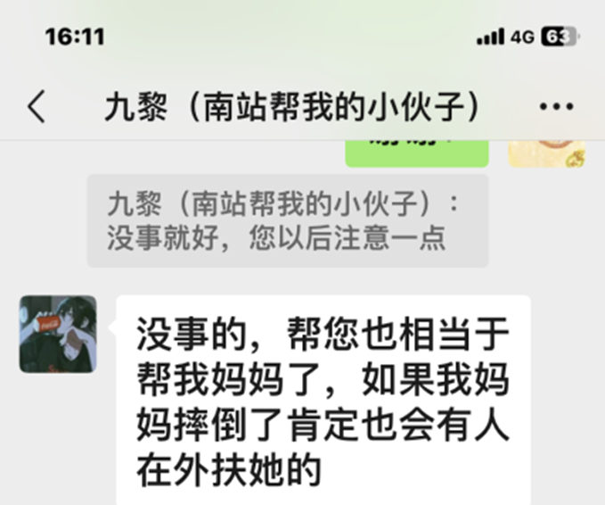 在出站检票口,他们两人终于加上了微信。当王女士表达要感谢时,小杨说,“没事的,帮您也相当于帮我妈妈了,如果我妈妈在外摔倒了肯定也会有人扶她的。”小杨朴实的话语让王女士十分感动。几经周转联系上星际娱乐场